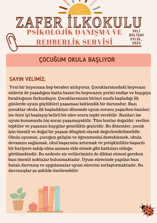 OKULA UYUM İLE İLGİLİ HAZIRLADIĞIMIZ VELİ BÜLTENİNİ SİZLERLE PAYLAŞIYORUZ. FAYDALI OLMASI TEMENNİMİZLE...